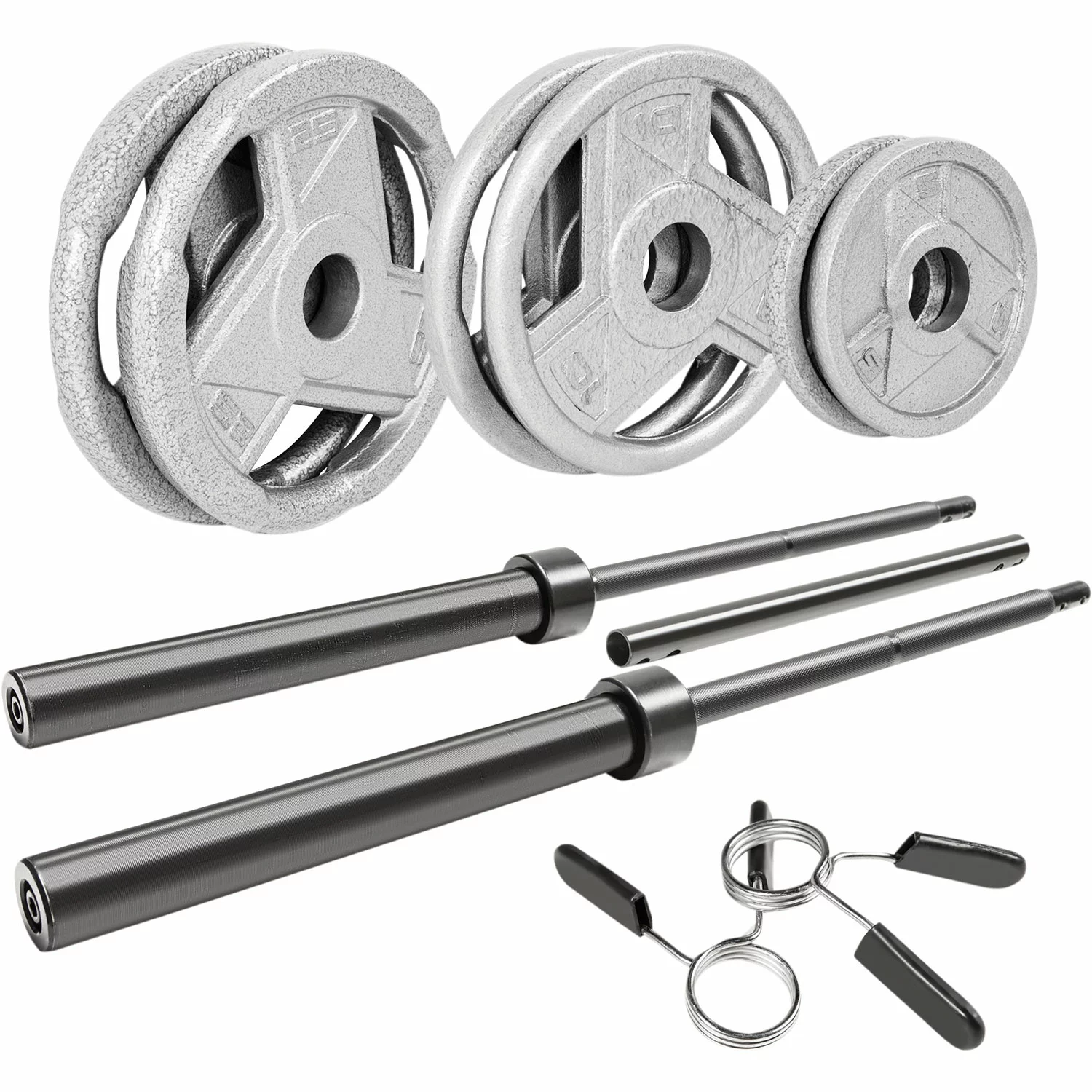 Includes: (1) 30 lb. Olympic 3-piece bar, (2) 25 grip plates, (2) 10 lb. grip plates, (2) 5 lb. plates, (2) clip collars