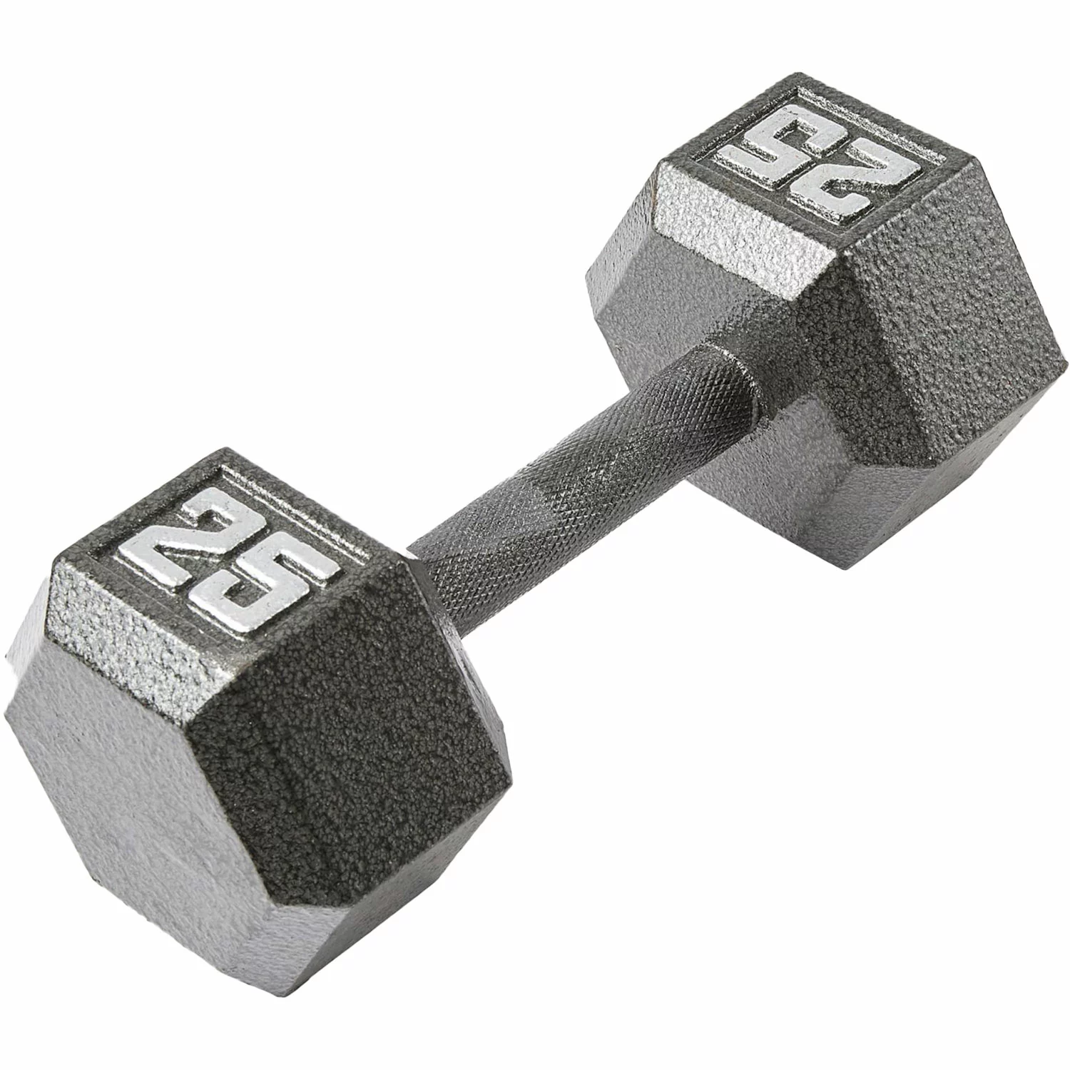 This 25 lb. cast iron hex dumbbell is a great addition to any home gym.
