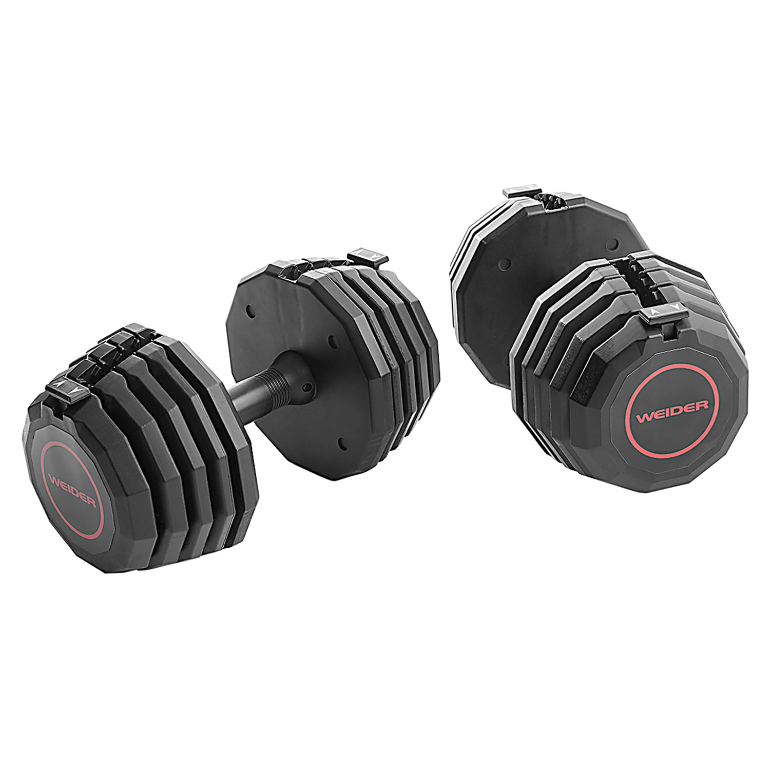 Enjoy tons of workout possibilities with 10 dumbbells in one set. The Weider® Select-A-Weight 50-lb. Adjustable Dumbbell Set brings the gym into your home so you can strengthen your entire body in one workout session.